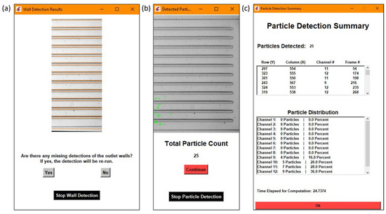 Each section is an example of the following: (a) wall detection results, (b) particle detection results, (c) a detailed summary of the particle detection results with the particle distribution calculation.