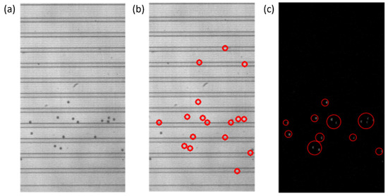Steps of the particle detection process that include creating a background image for background subtraction and the intermediate steps of consecutive video frame comparison. (a) A zeroth frame of a video that contains particles. The image cannot be used as a generic background without modification due to the presence of particles. (b) The same zeroth frame of the video with the particles replaced with the average row value. Regions outlined by the red circles represent those particles that were removed from the newly created background image. (c) The intermediate step after the comparison or subtraction of consecutive video frames and removal of negative values, before the SimpleBlobDetector function is run. The gray blobs, outlined by the red circles, are particles that will be detected by the SimpleBlobDetector and will be compared to the list of previously detected particles.