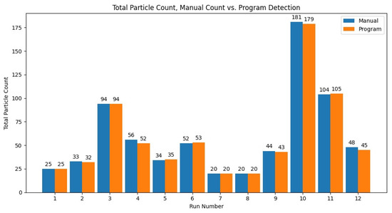 To test the accuracy of the particle detection function of the program, the results of 12 video files were compared between the program and manual analysis. Since the manual analysis can take upwards of a few hours, it limited the number of files for manual analysis. The results for the total particle count for the 12 runs compared to the manual analysis can be seen in Figure 7. The percent error was averaged across the 12 runs, with an average error of 2.14% and sample standard deviation of 2.42, or an overall total particle count accuracy of 97.86%.