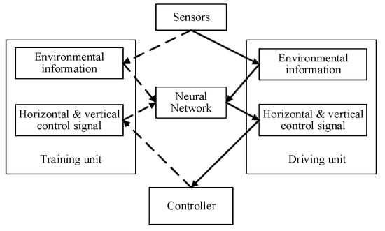 Figure 1 is the schematic diagram of end-to-end control based on a neural network. The end-to-end method uses a deep neural network to fit the complex relationship between input and output, to realize the direct mapping from input data to output results. Through the acquisition of the surrounding environment information by the sensor, and then through the neural network, the control signal of the whole vehicle is predicted and output, and the control signal includes the horizontal control signal and the vertical control signal. The vehicle horizontal signal entails control of the vehicle lateral position error and yaw rate error, and the vehicle vertical signal control refers to control of the vehicle relative distance error and relative speed. Reinforcement learning does not calculate the control information directly, the method turns decision-making into a state-transition problem, and the reward function is used to modify action choices and strategies [].