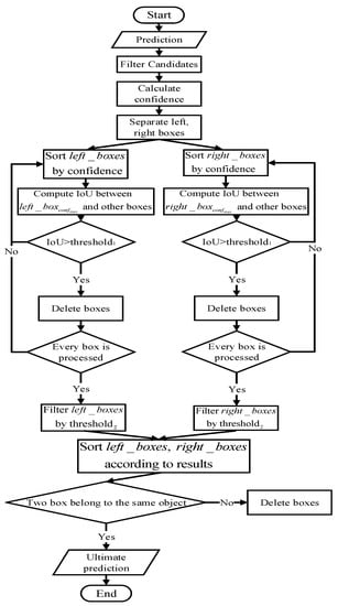 Every prediction result corresponds to two candidate boxes during binocular object detection. Due to the influence of angle and light, the same object may have large difference between the left and right view in the image. This paper improves NMS for binocular object detection, splits the left and right boxes during filtering, and finally restores the new predictions. The schematic diagram is shown in Figure 2, which filters the candidate area from the initial prediction result and then calculates its confidence. Next, the image is divided into two left and right boxes, which, respectively, use the NMS method to filter the candidate area. The network needs to compare the results of the two boxes. Finally, it can predict the candidate box for output.