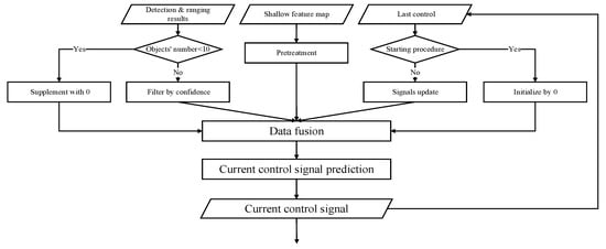 The data update process of the prediction algorithm. Firstly, the model integrates the binocular detection and ranging results that select the top binocular prediction objects sorted by confidence, which will be supplemented with if the screening results are lower than . Then, the shallow feature map from the binocular images is entered into the model; meanwhile, we need the control signal of the previous stage as input. Combining these three pieces of information allows us to calculate the control signal at the current moment, and finally it is output.