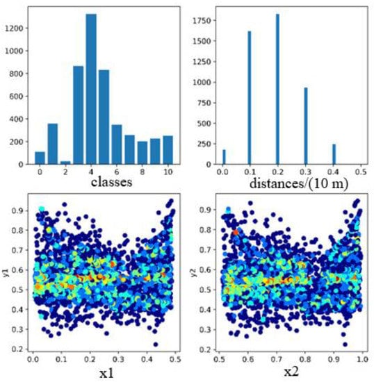 This paper collects images, the distance information of the objects, and construction machinery walking signals in a construction machinery park at the normal traveling speed (below 5 km/h) of a crawler excavator to construct the dataset. The dataset contains 1007 pictures, including the 11 categories of people, bicycles, motorcycles, trees, shurbs, containers, doors, engineering, steps, the engineering_trail, and the first_landmark. Figure 5 is the statistical graph of the label data. Motorcycle (category2) appears 28 times, which is not obvious in the category statistical graph in the upper left figure. The distance between the objects in the upper right figure is roughly calculated according to the rounding, and the distance distribution of the objects is between 0 and 55 m. The left and right lower pictures count the left and right boxes of the object, respectively, and the left and right boxes are evenly distributed in the left and right views. The dataset is divided into training set and test set according to a ratio of 3:1.