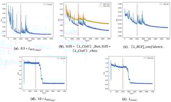 The loss function curve. (a) The classification loss curve when β is equal to 0.5; (b) the localization loss curve, including the left box and the right box when γ is equal to 0.05; (c) the confidence loss curve when θ is equal to 1; (d) the ranging loss curve when δ is equal to 10; and (e) the total loss curve is the sum of the above losses.
