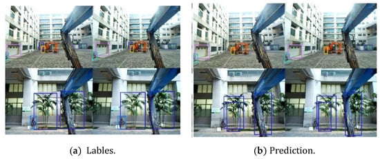 Figure 8 is the final detection diagram of the system. The different colors in the box represent different categories. This paper splits the binocular recognition ranging data set into the left and right views, respectively, for comparison experiments with the YOLOv5 algorithm, and the training process of the model is the same as the binocular detection network. Table 1 is the detection and ranging’s precision of different categories under each model weight. The precision of the model in this paper is significantly improved compared to YOLOv5 because of the dual-target non-maximum suppression with an average precision of 69.62%. The average ranging error of the model is 4.55 m, which can meet the walking demand of construction machinery.