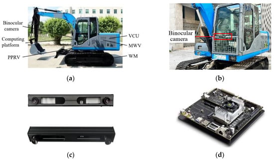 The automatic walking platform of the electric crawler excavator. (a) is the arrangement position of various equipment on the crawler excavator; (b) is the location where the binocular camera is installed on the crawler excavator; (c) is the binocular camera used in the experiment (the camera model is Kingcent); and (d) is the computing platform used in the experiment (the model of computing platform is NVIDIA Jetson TX2.5.2. Control Signals Loss).