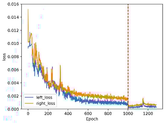 Classification and confidence prediction are the same as traditional detection tasks, and the loss functions are easier to drop. Data augmentation converts the original input image size of into during training and the image becomes , 40 × 40, and after down sampling by 32, 16, and 8, then the model predicts the offsets of these three scales. The image is filled into in the test and becomes , , and after down-sampling. During matching, the predicted offset with the grid converts the left and right candidate boxes to the coordinates of the original image; the second half of the predicted value of the right box offsets obtained from the 32 down-sampled feature map is offset by one grid, which leads to the right box’s loss function always being higher than the left box. The ranging loss function decreases significantly around 3000 rounds and then becomes stable. The overall loss function is greatly affected by the ranging loss function.