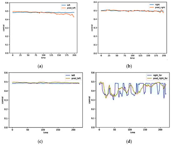 The test sets’ control signal prediction. (a) The left signal of test set1; (b) the right signal of test set1; (c) the left signal of test set2; and (d) the right signal of test set2.