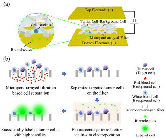 - Hun, T.; Liu, Y.; Guo, Y.; Huang, D.; Xu, M.; Wang, Q.; Li, Z.; Wang, W. In-Situ Electroporation on a Micropore-Arrayed Filter for Cell Labelling. In Proceedings of the 2020 IEEE 33rd International Conference on Micro Electro Mechanical Systems (MEMS), Vancouver, BC, Canada, 18–22 January 2020; IEEE: Piscataway, NJ, USA, 2020; pp. 473–476. [Google Scholar]