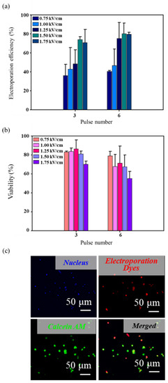 Figure 2a,b show that the electroporation efficiency inversely correlates with viability. When cells were exposed to electric field strengths higher than 1.25 kV/cm with six pulses, a high electroporation efficiency up to about 80% was exhibited, but the cell viability was less than 70%; whereas those electric field strengths of 0.75 kV/cm with three pulses showed a viability and electroporation efficiency of 83% and 36%, respectively. The optimum electric field strengths are required to consider viability and efficiency simultaneously. Thus, electric field strengths at 1.5 kV/cm, 100 μs pulse duration, three pulses, and 1000 ms pulse interval (denoted as 1.5 kV/cm/100 μs/3/1000 ms) is an optimal condition for both high electroporation efficiency (74.08 ± 2.94%) and cell viability (81.15 ± 3.04%). The short-term viability tested via the live/dead assay is shown in Figure 2c. Successful electroporation with maintained viability of 1601 cells showed triple-positive for blue, red, and green fluorescence colors (i.e., Nucleus+/EthD-1+/Calcein Green AM+).