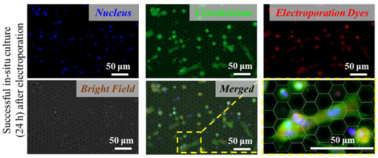 The ability to introduce foreign molecules, such as DNA, mRNA, fluorescent dyes, and proteins, into living cells has significant implications for various applications in cellular manipulation [1], cellular imaging [2], genome engineering [3], and disease treatment [4]. Various methods, including viral-mediated, chemical-mediated, and physical-mediated approaches, have been developed to deliver molecules into the cells. The viral-mediated approach is the most popular method of gene delivery because it is highly efficient, while the application remains a considerable safety concern, including toxicity, immunogenicity, and chromosomal integration [5,6,7]. The chemical-mediated approach is often used to deliver intracellular biomolecules, but it also struggles with the toxic effects, particularly molecules and limited cell types [6]. Compared to other physical methods (e.g., microinjection, optoporation, and sonoporation), electroporation is considered an effective and powerful technique because it is easier to perform and has the ability to introduce types of molecules into target cells without potentially damaging cells [8,9].