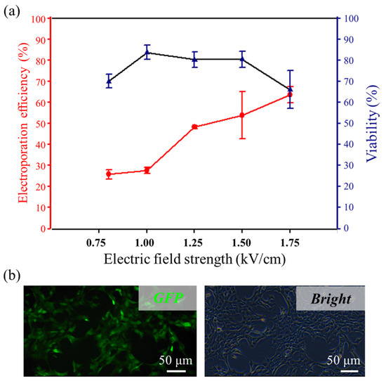 Transfection of plasmid in 1601 cells. (a) The electroporation efficiency and viability under different electric field strengths (n = 3 for every trial). (b) Fluorescence image of plasmid expression in the cells 24 h post-electroporation.