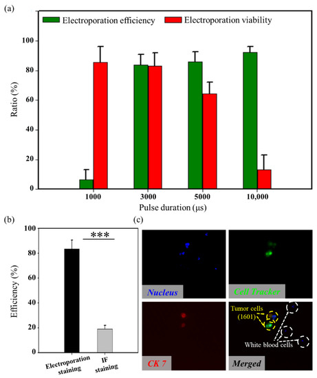 We further explored the functional protein delivery using this in situ electroporation system for highly specific tumor cell labeling. Specifically, we established an antibody electroporation-based imaging approach to introduce fluorescent dye-conjugated antibodies into target living cells. The accumulation of biomolecules in the vicinity of the cell would cause diffusion-based delivery in the final stage [45], so the internal fluorescence intensities are directly proportional to the pulse durations. In order to achieve high-efficiency macromolecular protein delivery, four different pulse durations were used for testing. We observed that the variation of electroporation efficiency increased as the pulse duration increased. However, when the duration was 5000 μs, the cell viability was less than 80%, so we chose 3000 μs as an optimal condition (1.5 kV/cm/3000 μs/3/1000 ms), where the electroporation efficiency and cell viability were 83.7 ± 7.00% and 80.3 ± 8.71%, respectively (Figure 5a).