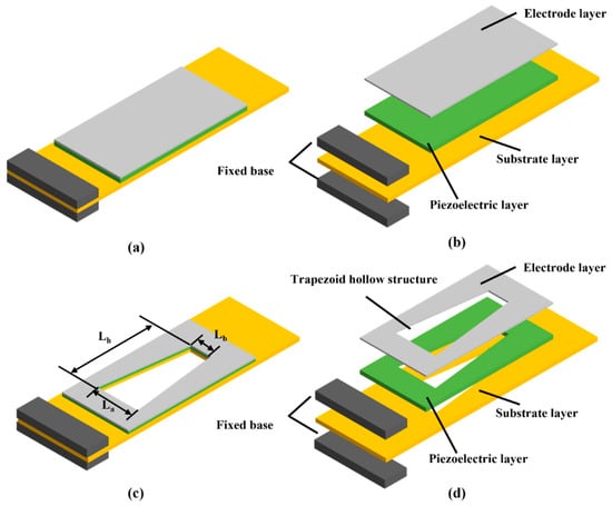 The structure and components of a traditional PEH is shown in Figure 1a,b, respectively. As can be seen, the left end is the fixed end of the cantilever, which is fastened to the excitation platform by fixed bases, and the right end is the free end, which would shake up and down with the vibration. The cantilever beam can be deformed by force due to external vibration, so as to achieve different vibration states and produce matching outputs. An electrode layer, a piezoelectric layer, and a substrate layer are the three primary layers of the PEH. In this work, a silver layer, a PZT layer, and a copper substrate are adopted as the electrode layer, the piezoelectric layer, and the substrate layer, respectively, and size of copper substrate is optimized at first. Figure 1c,d represent a high-performance PEH with an optimized copper substrate and a trapezoidal hollow structure, wherein La, Lb, and Lh in Figure 1c represent the length of the bottom near the fixed end of the PEH, the length of the other bottom near the free end of the PEH, and the height of the trapezoid, respectively.