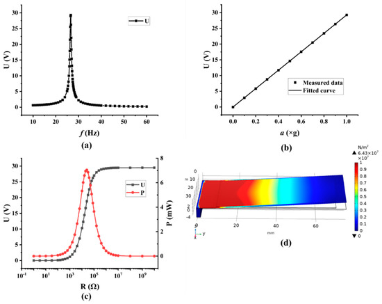 Through frequency sweeping, the voltage output of the piezoelectric cantilever beam at different frequencies is calculated, and the results are depicted in Figure 3a, wherein the frequency range is from 10 Hz to 60 Hz. As can be seen, the resonance frequency and the peak output voltage are 26.6 Hz and 29.272 V, respectively. Subsequently, under the condition of the resonance frequency, the peak voltage output at diverse accelerations is simulated, wherein the acceleration ranges from 0 g to 1.0 g with a step size of 0.1 g, and the result is shown in Figure 3b. A linear relationship between the peak voltage output (U) and the acceleration (a) is obtained, with the regression equation of U = 29.27229 a. The relationship between the output voltage and the external load resistance is tested, and then the relationship between the output power and the external load resistance is calculated correspondingly, and the results are shown in Figure 3c. As can be seen, as the value of the external load resistance increases, the voltage output of the PEH at the resonance frequency would increase accordingly, at first, and then would tend to stabilize, while the power output would increase at first and achieve a peak, and then decrease. According to the maximum power transfer theorem [42], when the value of external load resistance is equal to the resistance of the piezoelectric cantilever beam, the peak output power would be achieved and, therefore, the resistance of the piezoelectric cantilever beam can be calculated to be 24.2 kΩ. The stress distribution of the piezoelectric layer at resonance frequency on the outside of the surface of the piezoelectric layer is simulated, and the result is presented in Figure 3d. It is found that the stress level is concentrated near the fixed end and decreases toward the free end of the cantilever.