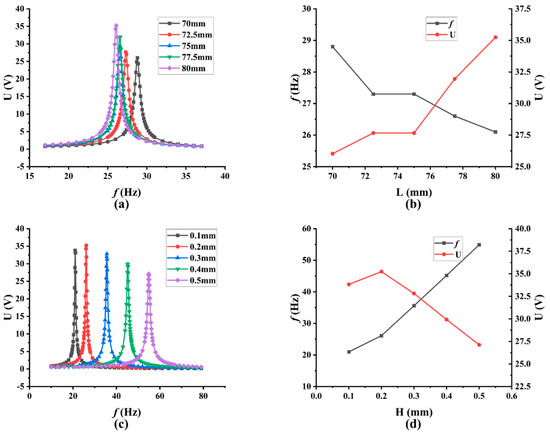 Simulation results at diverse copper substrate size: (a) voltage output at different frequencies with diverse lengths; (b) resonance frequency and voltage output with different lengths; (c) voltage output at different frequencies with diverse thicknesses; (d) resonance frequency and voltage output with different thicknesses.