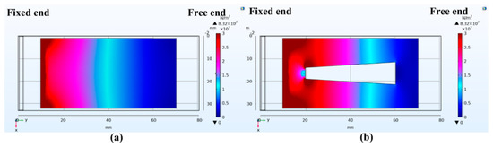 Surface stress distribution of piezoelectric cantilever beam: (a) unhollowed structure; (b) with a trapezoidal hollow structure.
