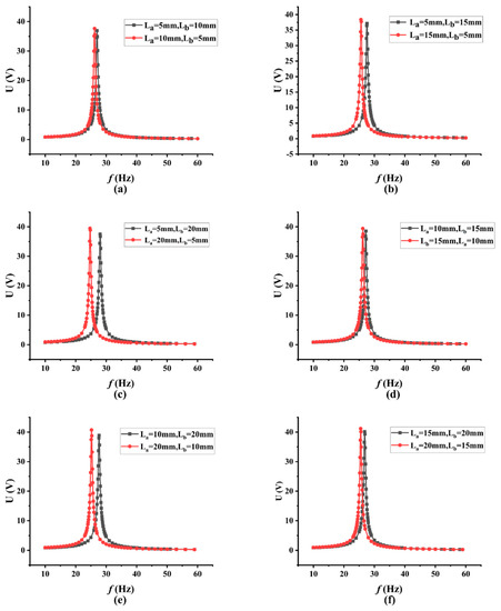 The hollow design of isosceles trapezoid is then replicated on the PEH. The size of the trapezoid hollow includes the length of the bottom near the fixed end (La), the length of the other bottom near the free end (Lb), and the height of the trapezoid (Lh), which has been shown in Figure 1c. As the trapezoid hollow structure with too large an area may cause the fracturing of the piezoelectric layer in practical application, the height of the trapezoid hollow is determined to be 40 mm, that is Lh = 40 mm. The lengths of the two bottoms La (near the fixed end) and Lb (near the free end) are selected in the range of 5 mm to 20 mm, with a step size of 5 mm. Twelve PEH models with trapezoidal hollow holes of diverse sizes were finally obtained, and were divided into six groups with two models in one group. The two models in each group have the opposite bottom size. For example, when one model has the size of La = 5 mm and Lb = 10 mm (La < Lb), the other one must have the size of La = 10 mm and Lb = 5 mm (La > Lb), respectively. The results of the six groups of PEH models are summarized in Table 4 and Figure 6. In Figure 6, the black curve represents the condition of La < Lb, and the red curve represents the condition of La > Lb. It can be concluded from Figure 6 that the peak voltage output would be larger, and the resonance frequency would be smaller, under the condition of La > Lb. Therefore, La should be designed to be larger than Lb in order to obtain the optimized peak voltage output and the lower resonance frequency.