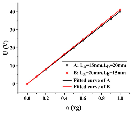 As shown in Figure 7, both A (La = 15 mm, Lb = 20 mm) and B (La = 20 mm, Lb = 15 mm) are cantilever beams with trapezoidal holes. Their output voltage (U) has a linear relationship with acceleration (a), and the corresponding equations are U = 40.17504 a and U = 41.18206 a, respectively.