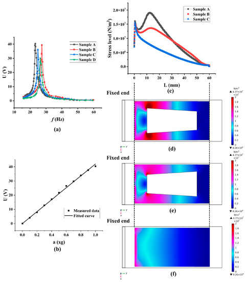 The output voltage of piezoelectric cantilever beam (Sample A) with a trapezoidal hole under different accelerations is shown in Figure 9b. The measured data are fitted to obtain the corresponding equation of U = 42.03117 a.