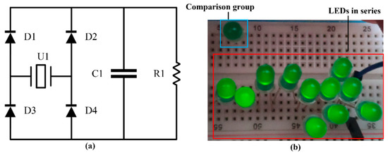 Figure 10 shows a simple application of a piezoelectric cantilever beam. Figure 10a shows a circuit that converts alternating current into direct current, in which U1 is a piezoelectric cantilever beam, D1, D2, D3, and D4 are four diodes, C1 is a filter capacitor, and R1 is a load. In Figure 10b, the LED in the blue box is not connected to the circuit as a comparison group, and the series LEDs in the red box are lit by piezoelectric cantilevers. Finally, the maximum output power of Sample A is 4.49 mW, which can satisfy some ultra-low power consumption electronic devices. The energy consumption of some low power device is shown in Table 6 [16].