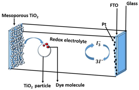 The following is a typical DSSC configuration: the mesoporous oxide layer, which is made up of a network of TiO2 nanoparticles sintered together to form the electronic conduction channel, is at the heart of the device. The film thickness is normally around 10 µm and is made up of nanoparticles with diameters ranging from 10 to 30 nm. The film’s porosity ranges from 50 to 60%. Atop a glass or plastic substrate, the mesoporous layer is formed on a transparent conducting oxide (TCO) [10]. As shown in Figure 1, a common substrate is glass-covered with fluorine-doped tin oxide (FTO). On the surface of the nanocrystalline film, the charge-transfer dye is placed as a monolayer. When a dye is photoexcited, an electron is injected into the oxide’s conduction band, leaving the dye in its oxidised state. Electron transfer from the electrolyte, which is commonly an organic solvent containing the iodide/triiodide redox system, returns the dye to its ground state.