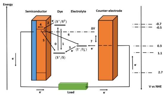 The required turnover number for a DSSC to be durable for more than 15 years in outdoor installations is 108, which can be met by ruthenium complexes [12]. The difference in the electrochemical potential of the electron at the two contacts corresponds to the voltage created under light. The difference between the Fermi level of the mesoporous TiO2 layer and the redox potential of the electrolyte is the difference in DSSC. Overall, no permanent chemical reaction is required to generate electric power. Figure 2 depicts the basic electron transfer mechanisms in a DSSC, as well as the potentials for a cutting-edge device based on N3 dye adsorbed on TiO2 and as the redox couple in the electrolyte.