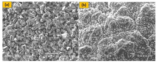 SEM images of CuI crystals deposited on the dyed TiO2 porous film: (a) CuI without molten salt; (b) CuI/1-methyl-3-ethyl-imidazolium thiocyanate composite electrolyte, adapted from reference [42]. [Reproduced with kind permission].
