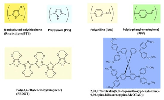 The organic molecular solids and polymers provide attractive diversity comparable to inorganic HTMs and in conjunction are amenable to chemical modifications to fit different needs. Examples include polypyrrole, polythiophene, and polyaniline, to name a few, as shown in Figure 4. These materials exhibit a good balance of electrical, electronic, and optical properties of metals and semiconductors, and mechanical flexibility of conventional polymers. Prior work demonstrated their applications in solid-state DSSCs [45]. Despite considerable progress, the low conversion efficiency of solid-state DSSCs remains a challenge. Solid conductive materials’ penetration into semiconductor porous films is still low, and organic HTM conductivity is limited by diffusion.
