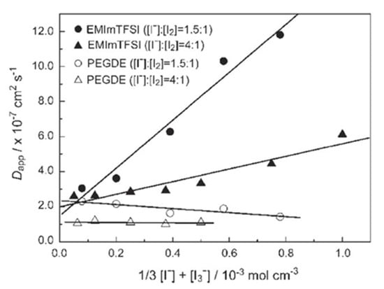 Equation (5) demonstrates that when is switched from to , and should be in a close immediacy to one other. Because both reactants are negatively charged, collisions between and are often problematic. Ionic liquids are made entirely of ions and have a relatively high molar concentration. It was discovered that triiodide could be transported to the counter-electrode not only by diffusion, but also by a non-diffusional hopping mechanism similar to that of Grotthus. Similar results were shown by Kawano et al. [54] who observed an increase in apparent diffusion coefficient (Dapp) of with an increase in I2 concentration in ionic liquid compared to the normal solvent of the same viscosity. Figure 5 indicates that Dapp depends on the concentration of the redox couple, and the value is larger for EMImTFSI than for polyethylene glycol diglycidyl ether (PEGDE).