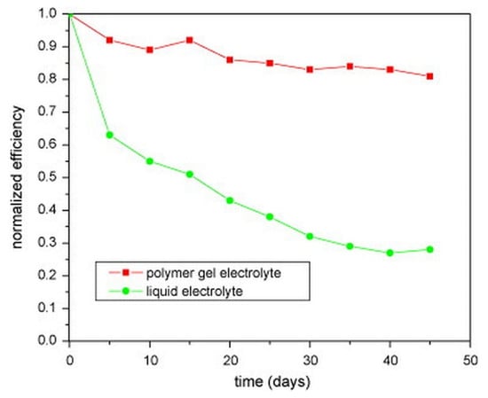 DSSCs containing the GPE have better long-term stability than DSSCs using liquid electrolytes. This is owing to the rapid devolatilization of liquid electrolytes and electrolyte leaks observed during their long-term operation. The results from prior work [60], as shown in Figure 6, shows that the efficiency of DSSC with the GPE PMMA–EC/PC/DMC–NaI/I2 declines by 8% after 5 days, while the efficiency of DSSC with liquid electrolyte drops by nearly 40%. After 40 days, the DSSC with a polymer gel electrolyte retains 83 percent of its initial light-to-electrical energy conversion efficiency, compared to only 27 percent for the DSSCs with liquid electrolytes [60].