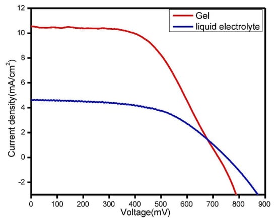 Abisharani et al. [71] obtained a high performance with better stability for DSSCs through the incorporation of the additives of the N, S, and O groups with GPE. The corresponding calculations of the DFT revealed that the anchoring groups of the additives play an important role in the charge transfer mechanism, and the TiO2 surface contained strong covalent/non-covalent bonds. In another work, Lobregas et al. [72] used potato starch modified with grafting 1-glycidyl-3-methylimidazolium chloride (GMIC) as a gel-polymer electrolyte, and obtained 0.514% efficiency and relative stability due to the good filling contact between the electrodes. Figure 7 shows the photocurrent–voltage curve characteristics of liquid and a modified gel–polymer electrolyte. Table 1 lists the performance characteristics of different modified gel polymers in DSSCs.