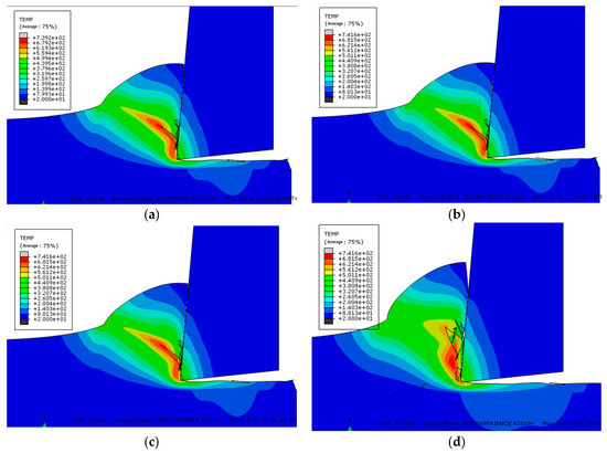 Changes in the cutting temperature field at the beginning of cutting (°C). (a) t = 5 × 10–4 s (b) t = 8.8 × 10–4 s. (c) t = 1.2 × 10–3 s (d) t = 2.2 × 10–3 s.