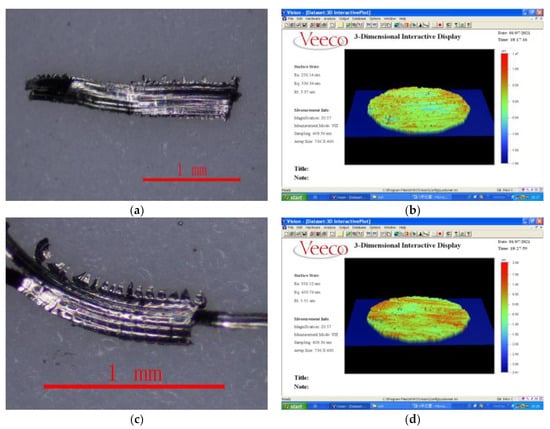 In this chapter, the influence of cutting factors is ignored when the relationship between cutting force, chip morphology and surface quality is studied, and only cutting force is used as the influencing factor. It can be seen from Figure 10a–h that the degree of chip sawtooth generated during the cutting process becomes larger and larger with the gradual increase in the cutting force, and the chip burr becomes sharper and sharper. In addition, the bottom part of the chip is relatively flat, and the other surface is sawtooth shape. It can be seen from Figure 10a that when the cutting force is low, the cutting speed at this time is relatively low, the shape of the chip is band-like, and the upper part of the chip has no clear saw teeth. However, when the machining speed increases, the serration of the chips becomes more and more serious, as shown in Figure 10c,e,g. This is because the shear force on the shear slip surface will increase sharply with the increase in the cutting speed, which will make the shear deformation on the shear slip surface more and more concentrated. Shear slip on the shear plane is also increasing, so chip serrations are also becoming more pronounced.