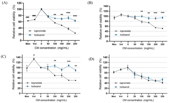 Figure 4. Cell viability according to the different fluid viscosity and shear-stress conditions at (A) static condition, (B) a rocker interval of 8 min, (C) a rocker interval of 4 min, and (D) a rocker interval of 2 min. CM—contrast media; Man—mannitol; HES—hydroxyethyl starch; Con—negative control group. Data are represented as the mean ± SEM. ### p < 0.001 versus control (0 mgI/mL); # p < 0.05 versus control (0 mgI/mL); ** p < 0.01 versus iopromide group of the same iodine concentration; *** p < 0.001 versus iopromide group of the same iodine concentration.
