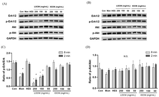 Figure 5. Representative immunoblots of Akt, p-Akt, Erk1/2, p-Erk1/2, and β-actin at (A) a rocker interval of 8 min and (B) a rocker interval of 2 min. (C) Ratio of p-Erk1/2/Erk1/2. (D) Ratio of p-Akt/Akt. Data are represented as the mean ± SEM. * p < 0.05 versus control of 2 min interval, # p < 0.05 versus control of 8 min interval. LOCM—low-osmolar contrast media; IOCM—iso-osmolar contrast media; Con—control; Man—mannitol; HES—hydroxyethyl starch; N.S.—nonsignificant.