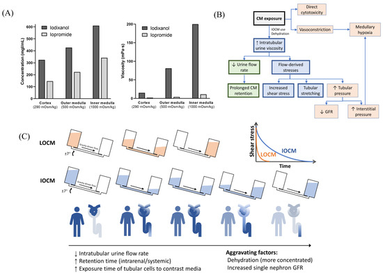 Figure 6. Overview of the proposed models of contrast-induced nephropathy. (A) Iso-osmolar contrast media are twice as concentrated as low-osmolar contrast media and have a much greater viscosity. Data from Jost et al. [26]. The concentration and viscosity of CM are obtained from an in vitro dialysis model using polyethylene glycol solution with different osmolalities (290, 500, and 1000 mOsm/kg, which represents the mean osmolality of the renal cortex, outer medulla, and inner medulla, respectively). (B) Overall mechanisms of contrast-induced nephropathy. (C) Comparison of iso-osmolar and low-osmolar contrast media in our model. CM—contrast media; LOCM—low-osmolar contrast media; IOCM—iso-osmolar contrast media; GFR—glomerular filtration rate.
