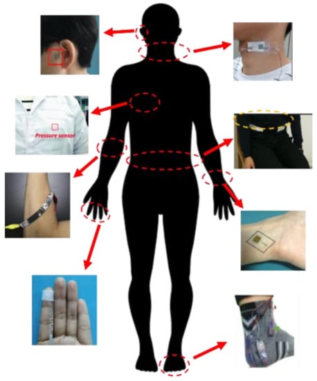 Flexible wearable sensors are devices that can be worn and attached to different positions on the human skin to monitor various biological signals continuously without affecting the normal activities of the wearer. Flexible wearable pressure sensors exhibit a huge development potential in humanmachine interaction, virtual reality, healthcare monitoring, and disease diagnosis owing to their miniaturization and skin-friendliness. These sensors can continuously monitor pulse signals to prevent cardiovascular diseases [1,2,3,4,5,6,7], be used for developing respiration monitoring systems to prevent respiratory disorders such as sleep disorders and asthma [8,9,10], and closely detect tiny human activities to ensure early detection of abnormal motion control diseases such as Parkinson’s disease [11,12,13]. The detection positions of the reported wearable pressure sensors mainly include the ears [6], neck [10], arms [13], waist [14], wrists [15], fingers [16], chest [17], and feet [18], as shown in Figure 1.