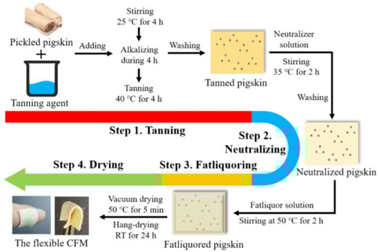 The preparation of CFM refers to industrial tanning technology, and the consumption of reagents used in the preparation process was calculated based on the weight of the pigskin. Pickled pigskin, used as the raw material for the preparation of the CFM, was supplied by a local tannery in China. As shown in Figure 2, the entire preparation process includes four steps: tanning, neutralization, fatty liquoring, and drying.