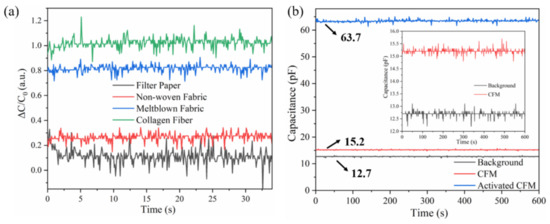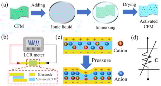 To verify the effectiveness of the ionic liquids for the sensor, the common and activated CFMs were used in the control experiment, and the corresponding results are shown in Figure 5b. The capacitance (C) formula is as follows: