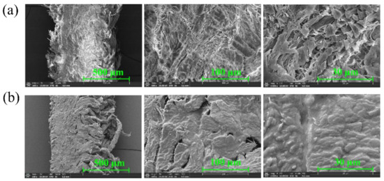 Photomicrographs of the cross-section of CFM before and after immersion in the ionic liquid were observed using field-effect scanning electron microscopy (SEM), as shown in Figure 4a,b, respectively. The magnifications from left to right are 100×, 500×, and 2000×, respectively. CFM consists of collagen molecules with the triple helical structure; it is a three-dimensional network material with multilevel structure characteristics that is formed by the layer-by-layer assembly [34]. Notably, there are clear fibrous structures and interstices between the fibers before immersion in the ionic liquid, and these interspaces are filled after the immersion in the ionic liquid. This indicates that the ionic liquid is successfully loaded into the material.