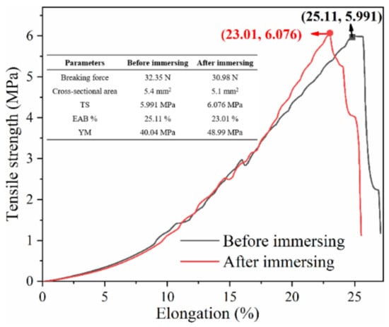 where Fmax denotes the breaking force of the material, A is the cross-sectional area (the product of thickness and width), L and L0 represent the length of the material when it breaks and its initial length, respectively, F is the tensile force on the material, and ΔL is the change in length. The relationship between TS and elongation for the material before and after immersion in the ionic liquid is shown in Figure 6. Evidently, the TS is 5.991 and 6.076 MPa, the EAB% are 25.11% and 23.01%, and the YM values are 40.04 and 48.99 MPa. These results demonstrate that no significant differences between the mechanical properties were observed, which explains why the mechanical properties of the CFM are almost unaffected by the ionic liquid load.