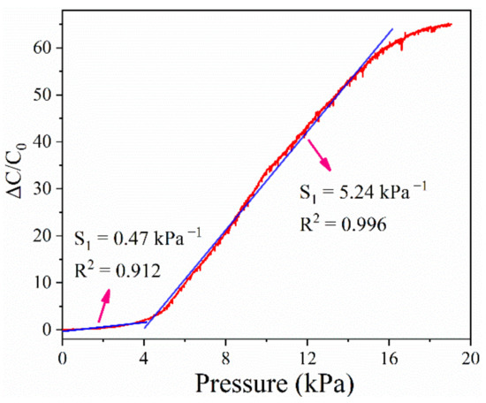 The capacitance of the sensor continues to increase with a continuous increase in the pressure applied to the sensor. Figure 7 shows the relationship between ΔC/C0 and pressure, wherein the slope of the curve yields the sensitivity of the sensor according to Equation (1). The sensor exhibits a linear sensitivity of 5.24 kPa−1 in the pressure range of up to 16 kPa. In the absence of external pressure, the distance between the dielectric layer and the electrode is microscale, and the contact area and capacitance are very small. The contact area between the dielectric layer and the electrode increases with the external pressure, and when the pressure increases to a critical value, the capacitance of the sensor is mainly affected by the deformation of the dielectric layer. Therefore, the sensor has different sensitivities in different pressure ranges.