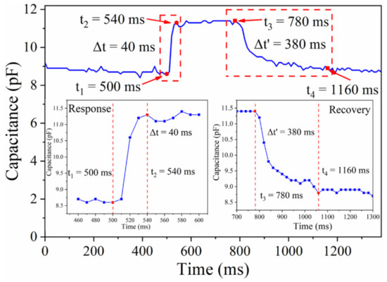 Figure 8 shows that the sensor exhibits a rapid increase in the capacitance within 40 ms, and the response time of the sensor is comparable to that of the biological skin (30–50 ms) [36]. Furthermore, the capacitance of the sensor recovered to its initial value within 380 ms after the load is removed. The longer recovery time is caused by the slow rebound of the CFM.