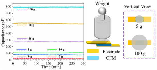 High stability is crucial for continuous-monitoring wearable sensors. The sensor was fixed on a horizontal table, and gravity was applied via weights in a natural state. The capacitance of the sensor was recorded within 5 h (sampling frequency of 10 Hz) under different pressures. The results, shown in Figure 9, demonstrate that the capacitance of the sensor remains stable for a long duration under different pressures. Because of the different contact areas between the weight and the sensor (as shown in the vertical view), the pressure applied on the sensor has a nonlinear relationship with the masses of the weights; thus, the value of capacitance has no reference significance.