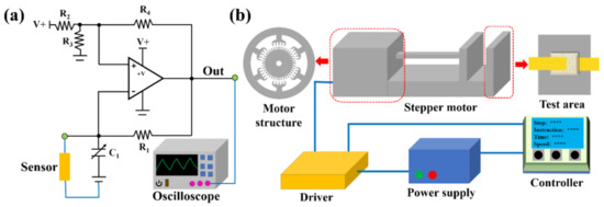 Owing to the low sampling frequency of the LCR meter, sensing data with high-frequency changes may not be accurately obtained. In this study, a real-time and rapid capacitance detection and matching pressure application systems were designed independently. Figure 10a,b show the control circuit diagram based on 555 timers and the drive concept diagram of the stepper motor, respectively.