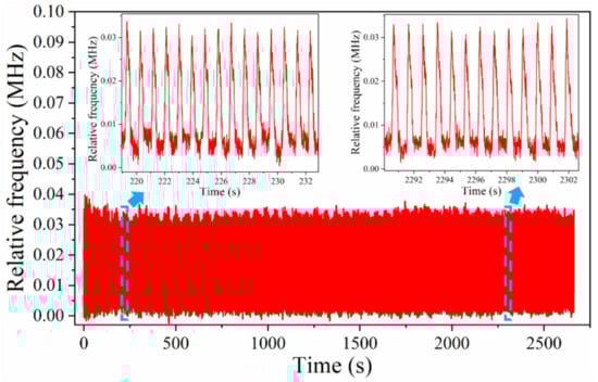 Figure 11 shows the frequency response curve of the sensor for approximately 3000 cycles of pressure application–relaxation. Although the temperature drift of the detection system caused a continuous increase in the frequency, the changes in the frequency for the pressure application–relaxation were equal, indicating that the sensor still exhibited a good response in the repeated experiments. The results demonstrate that the sensor can be effectively used to develop wearable devices and is expected to output physiological signals as well as achieve continuous human–motion monitoring. A video of the pressure application–relaxation is provided in the Supplementary Materials Video S1.