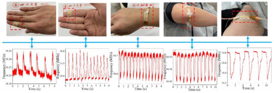 A simple experiment was conducted to record the signal and investigate the activity at different measurement positions on the human body. As shown in Figure 12, the sensor can be laminated on finger joints (inside and outside), wrists, elbow joints, and knee joints, and the activity signals of these parts, such as bending, can be captured as electric signals. The different waveform intervals represent the time difference of the activity; the different waveform intensities represent the strength of the activity, and the wave crest and trough represent the application and release of the pressure acting on the sensor. For the movement of the finger joints, the bending of the joint reduces the pressure on the sensor; the oscillation frequency increases, and the capacitance decreases. For the movement of the wrist, elbow, and knee, the bending of the joint increases the pressure on the sensor; the oscillation frequency decreases, and the capacitance increases. The ability to discriminate human activity verifies the feasibility of the sensor as a wearable device capable of medical diagnosis. Videos of the captured electrical signals are provided in Supplementary Materials Videos S2–S5, and the detectors are pasted to the elbow, wrist, and finger.