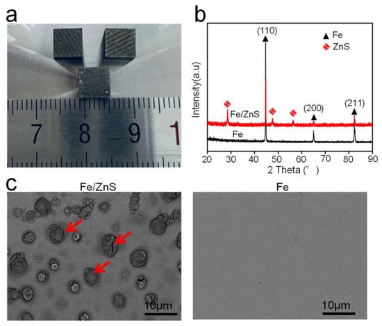 The LPBF-processed bulk parts were shown in Figure 1a, and the corresponding XRD spectrum was depicted in Figure 1b. Results showed that strong peaks corresponding to α-Fe phase was observed for Fe and Fe/ZnS parts. Besides, some strong peaks corresponding to ZnS phase presented in Fe/ZnS composite. The microstructure was observed by SEM, as shown in Figure 1c. No obvious holes and cracks were observed in the matrix of as-built parts, indicating their good forming quality. For the LPBF of the metal parts, the relatively high porosity is easily generated due to the insufficient liquid phase or severe molten pool evaporation, thereby reducing the performance including mechanical properties and corrosion resistance []. However, our SEM analysis showed the high densification rate was obtained. It was reported that the stable molten pool behavior could be achieved under the optimized laser parameters, so as to promote the densification of the parts []. For the Fe/ZnS biocomposite, the ZnS particles (as marked by the red arrows) were uniformly distributed in the matrix.
