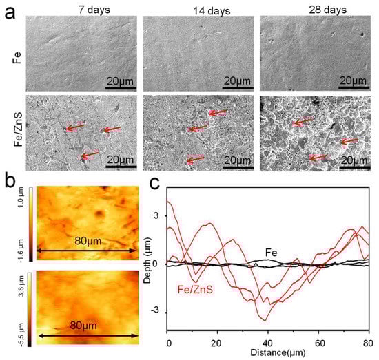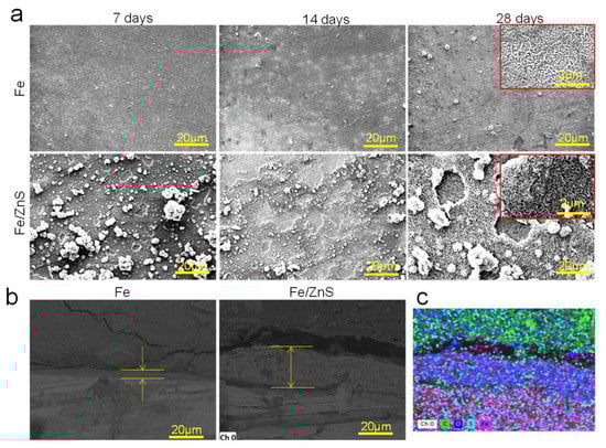 The corroded surface after immersion for 7, 14, and 28 days have bee shown in Figure 2a. Flat corrosion surface with little degradation product was observed for Fe part over the whole immersion period. As a comparison, a large amount of corrosion product was presented on the Fe/ZnS biocomposite, and a porous film with numerous corrosion pits was also observed. The corrosion pits obviously became deepened and expanded at day 28, accompanied by partial products falling off. The cross section after immersion for 28 days was examined by SEM, as exhibited in Figure 2b. Clearly, the thin corrosion film with a thickness of only ~4.8 μm was observed for Fe part. As for Fe/ZnS biocomposite, the thickness of corrosion film increased to ~23.8 μm. The element mapping analysis showed that the corrosion film mainly contained Fe and O elements, as shown in Figure 2c. Previous studies reported that the corrosion products on Fe matrix mainly contained oxides and hydroxides of Fe [].